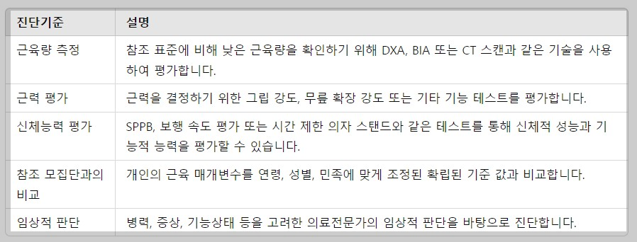 근감소증의 개별 기준은 지침과 설정하는 협회에 따라 약간 다를 수 있습니다.