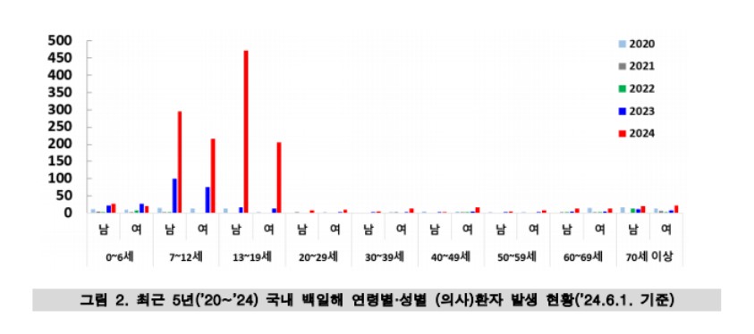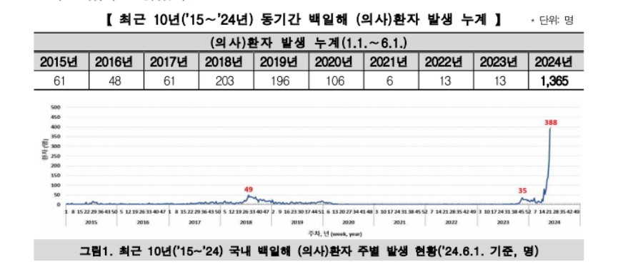 올해 백일해 환자가 1,365명으로(6.1일 기준) 2023년 동기간 13명의 105배 많이 발생,