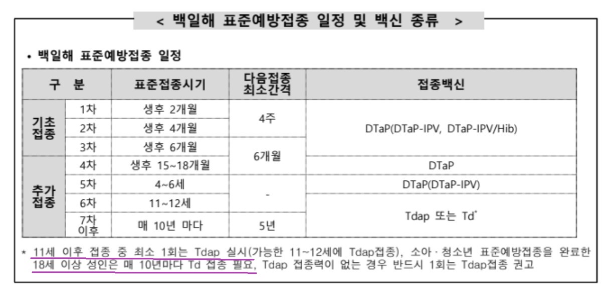 - 2차 접종 후 6~12개월 후에 Td 또는 Tdap 백신으로 총 3회 접종 (3회 중 1회는 Tdap 백신 사용)