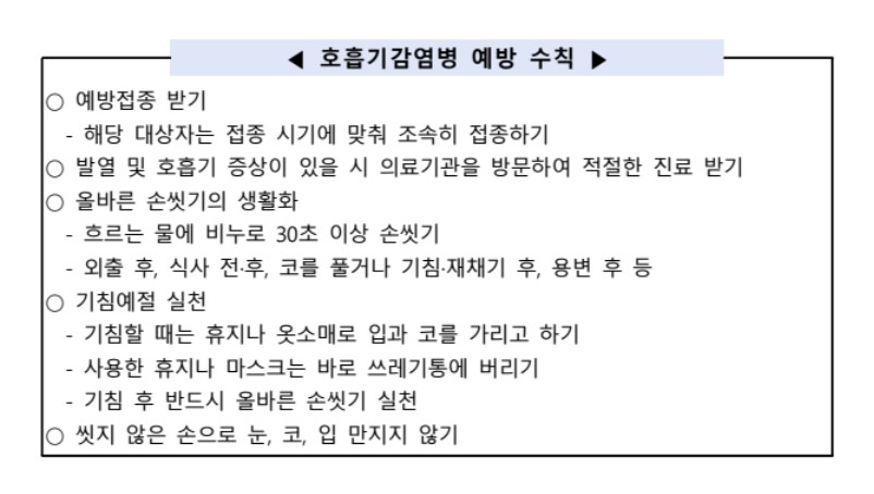 일상생활에서 손씻기, 기침예절 등을 실천하도록 지도와 관심을 가져야 합니다.