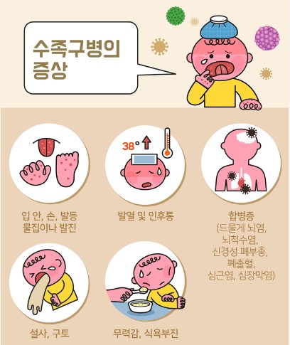 - 영유아가 수족구병 의심 증상과 38도 이상 고열, 팔다리 힘이 빠지고, 구토, 경련 등의 증상을 보이면 ; 신속히 의료기관을 찾아야 합니다.