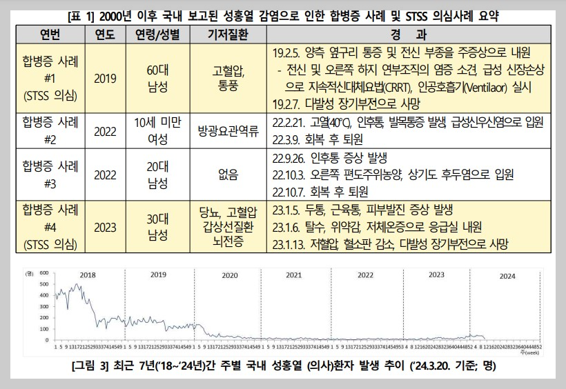 ∫ 2000년 이후 성홍열 감염으로 인한 합병증의 보고된 사례는 총 4건이며, 이 중 연쇄상구균 독성쇼크증후군(STSS)으로 의심되는 사례는 2건이었습니다.