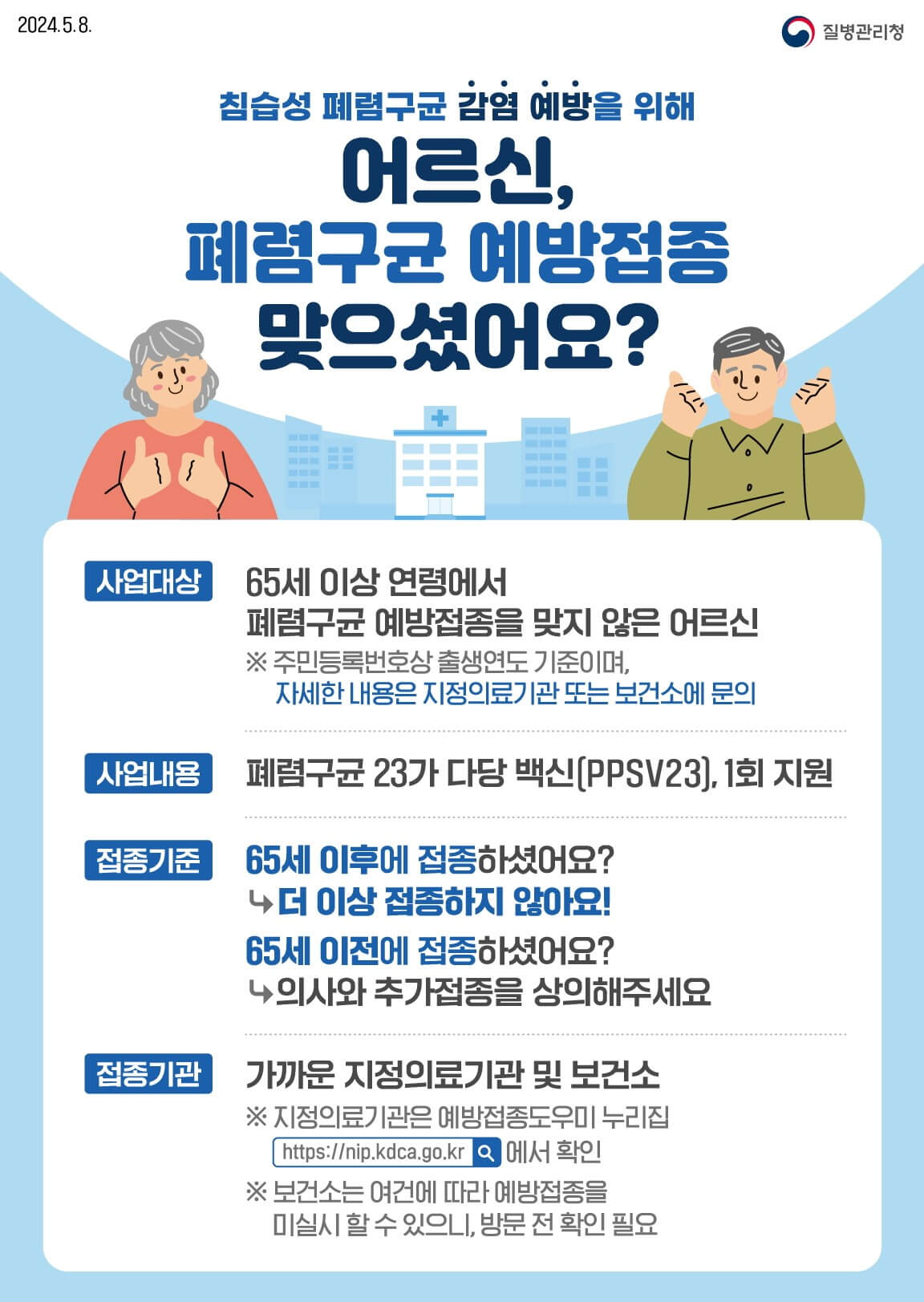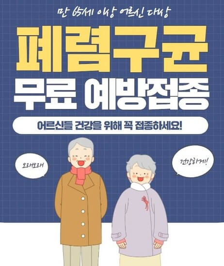 - 2013년부터 질병청은 [어르신 폐렴구균 국가예방접종 지원사업]을 시행하고 있습니다.