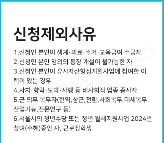 | ㅇ 서울시 거주자 - 주민등록번호 부여자만 신청 가능(재외국인 및 재외국민은 신청 불가) ㅇ 만 18세 ~ 만 34세 청년 ㅇ 최근 1년간 3개월 이상 근로하였거나, 현재 3개월 이상 근로중인 자 ㅇ 본인 근로 소득 금액이 세전 월 평균 255만원 이하 ㅇ 부.모(기혼시 배우자) 소득이 연 1억(세전 월평균 834만원) 미만이고, 재산 9억 미만 |